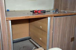 Here's another of those "I'm really glad I did it once, but I wouldn't want to do it again" projects. Our trailer came to us with an old desk with two cupboards underneath. One side didn't even have a door. It didn't work as storage; it didn't work as a desk. One side was too narrow for two knees. How could we keep the aluminum frame feel of the original trailer while making the desk useful for travel storage or as a work-from-home desk?